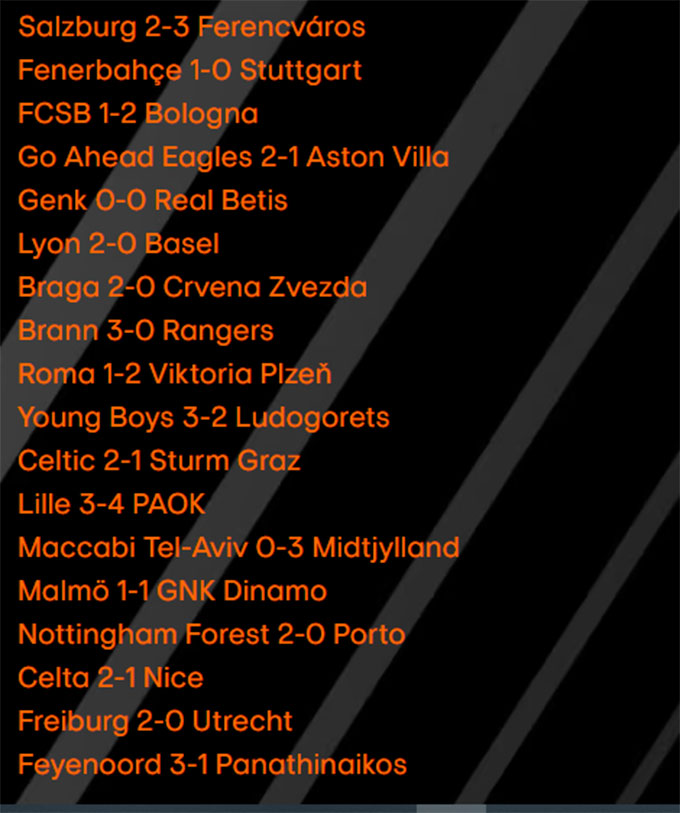 Ở một số cặp đấu đáng chú ý khác, Bologna giành chiến thắng sát nút 2-1 khi làm khách của FCSB. Về phần mình, Fenebahce hạ đối thủ Stuttgart tới từ nước Đức với tỷ số tối thiểu. Ngoài ra, Lyon xuất sắc đánh bại Basel 2 bàn không gỡ, còn Betis phải chia điểm trên sân của Genk sau trận đấu mà không bên nào chọc được thủng lưới dối phương.