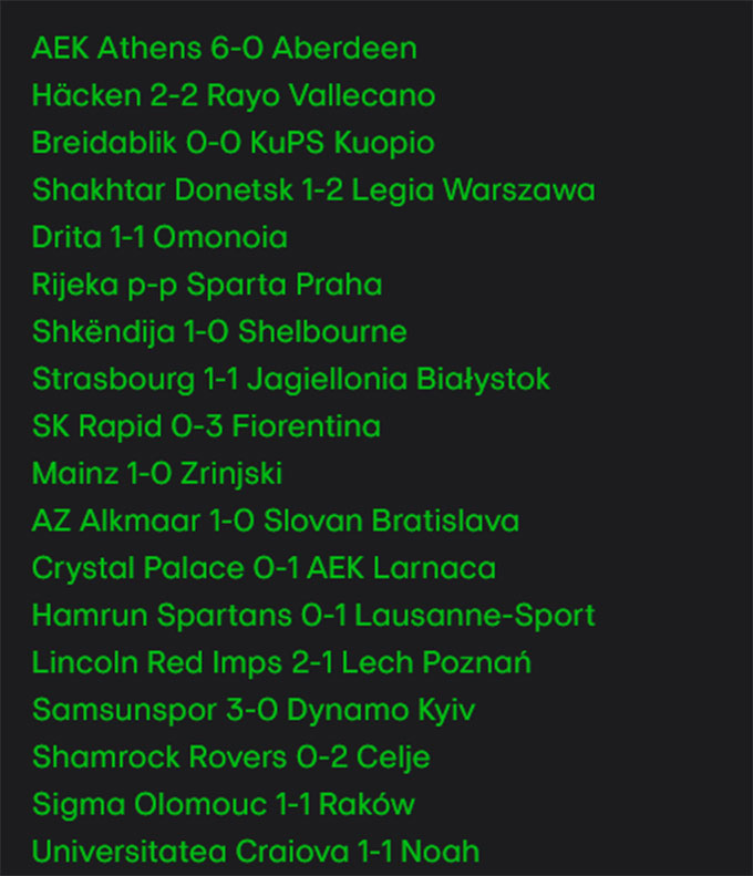 Chuyển sang diễn biến ở Conference League, Crystal Palace đã gây thất vọng khi để thua AEK Larnaca 0-1 trước sự chắng kiến của đám đông khán giả nhà. Nên nhớ, AEK Larnaca chỉ là CLB vô danh đến từ Cyprus, với tổng giá trị đội hình gần 12 triệu euro. Nhưng họ đánh bại Crystal Palace với lợi thế sân nhà cùng giá trị đội hình lên đến 484,54 triệu euro. Rayo Vallecano cũng chỉ kiếm được trận hòa 2-2 trên sân của Hacken, trong khi Fiorentina hủy diệt SK Rapid với tỷ số đậm 3-0.