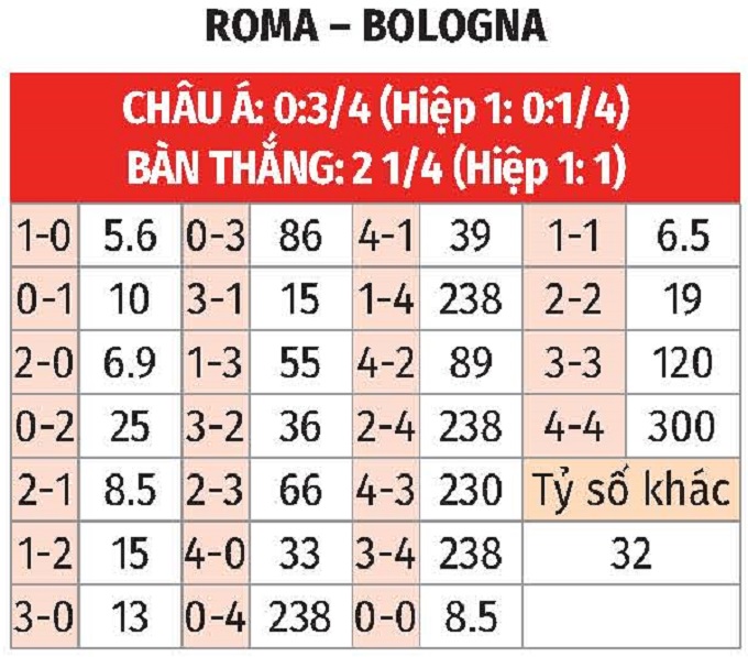 - Tối đa 1 bàn hiệp 1: 5 trận gần đây của AS Roma chỉ có tổng cộng 2 bàn thắng trong hiệp 1. Với Bologna, 10 trận vừa qua của đội khách cũng chỉ có 3 bàn thắng trước giờ nghỉ với 7 trận hòa 0-0. Ngoài ra, 4 trận đối đầu gần nhất có 1 bàn thắng trong 45 phút đầu.