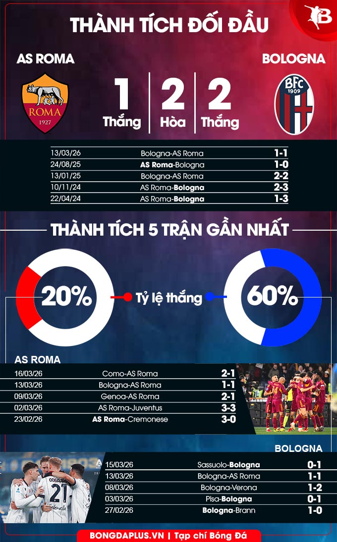 - Ít bàn thắng: 3 trận sân khách liên tiếp gần đây của Bologna đều kết thúc với chiến thắng tối thiểu. Hàng thủ AS Roma giữ sạch lưới 2/3 trận sân nhà vừa qua. Lịch sử chứng kiến 7/10 trận gặp nhau gần nhất có tối đa 2 pha làm bàn.