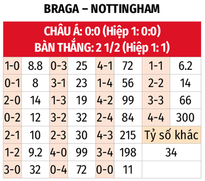 - 3 bàn thắng trở lên: 6/7 trận gần đây của Braga đều có từ 3 bàn thắng trở lên. Với Nottingham, 3/4 trận vừa qua của đội khách cùng trận đối đầu gần nhất cũng xuất hiện tối thiểu 3 pha làm bàn.