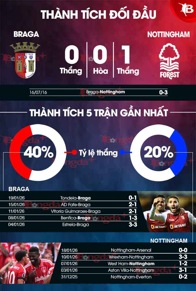 Trước khi tiếp đón Nottingham, Braga đã đối đầu với các đội bóng Anh 20 lần trong lịch sử và chỉ giành được 6 chiến thắng (4 hòa, 10 thua), gần đây nhất là chiến thắng 1-0 trước Wolves tại Molineux ở vòng bảng Europa League mùa giải 2019/20.