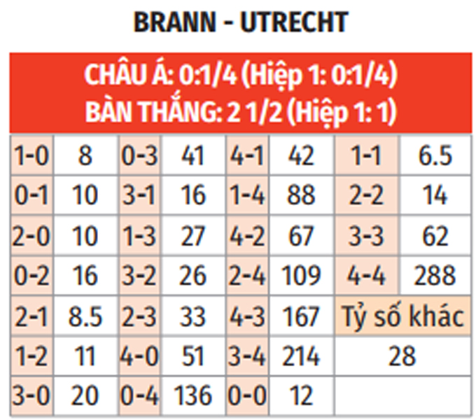 - Lẻ bàn thắng: 4/5 trận gần nhất của Brann có tổng bàn thắng chia hết cho 2. Ngoài ra, 3/4 trận vừa qua của Utrecht đều chứng kiến điều tương tự.