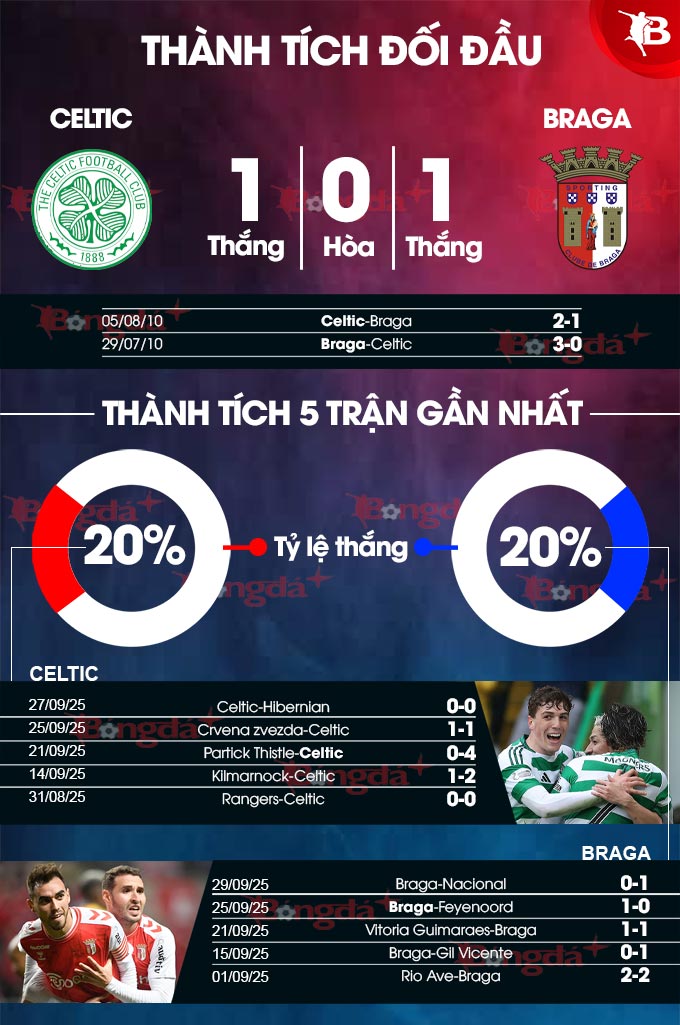 Celtic vẫn bất bại trong thời gian thi đấu chính thức và chưa từng nếm mùi thất bại trên sân nhà kể từ tháng 3/2025. Tuy nhiên, đối đầu với một Braga không dễ bị đánh bại, các cầu thủ Celtic khó có thể nghĩ tới chiến thắng. Kịch bản về một trận hòa là rất khả thi.