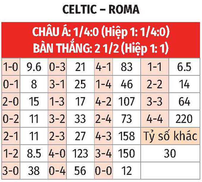 • Lẻ bàn thắng: 4/5 trận vừa xong của Celtic có tổng bàn thắng không chia hết cho 2. Ngoài ra, 7/10 trận vừa qua của Roma chứng kiến điều tương tự. Nhiều khả năng, trận đấu tới sẽ có kết quả tương tự.