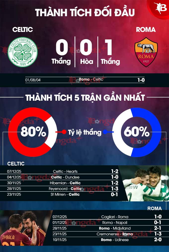 Ngoài ra, Celtic có lợi thế sân nhà và đang chơi cực hay tại đây khi chỉ thua 1/7 trận gần nhất còn Roma, họ thắng 5/7 trận sân khách dã qua.