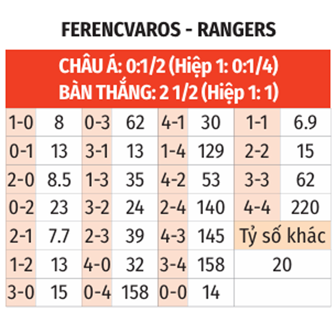 • Hai đội cùng ghi bàn: Ferencvaros đã thành công trong việc ghi bàn ở 5 trận gần nhất còn với Rangers là ở 4/5 trận vừa xong. Bên cạnh đó, Ferencvaros cũng ghi bàn ở 4/5 trận chính thức gần nhất trên sân nhà còn Rangers làm được điều tương tự ở 5 trận sân khách vừa qua. Với xu hướng như vậy, khả năng cao hai đội sẽ cùng tìm được đường vào khung thành của nhau.
