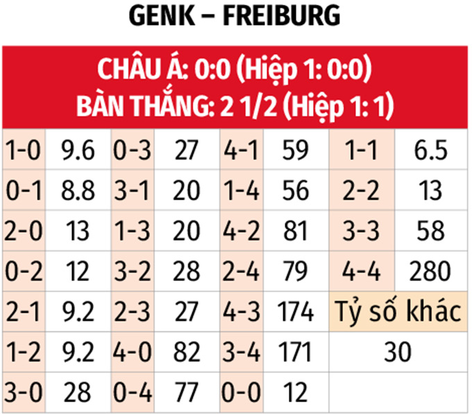 - Tối đa 1 bàn hiệp 1: 7 trận sân khách liên tiếp gần đây của Freiburg kết thúc hiệp đầu tiên với tỷ số hòa 0-0. 3 trận liên tiếp vừa qua của Genk khép lại 45 phút đầu với tỷ số tối thiểu.