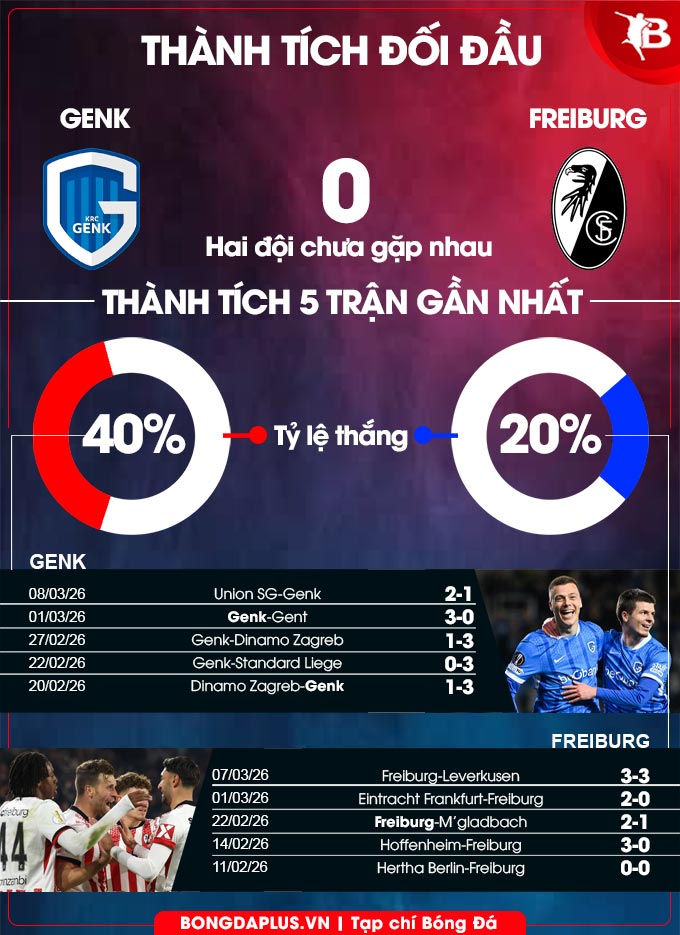 - Ít bàn thắng: Hàng thủ Freiburg chỉ để lọt lưới 4 bàn tại Europa League mùa này, trong khi hàng công tịt ngòi 5 trận sân khách liên tiếp gần đây. Với Genk, các chân sút chủ nhà chỉ ghi 11 bàn sau 8 trận tại vòng phân hạng.