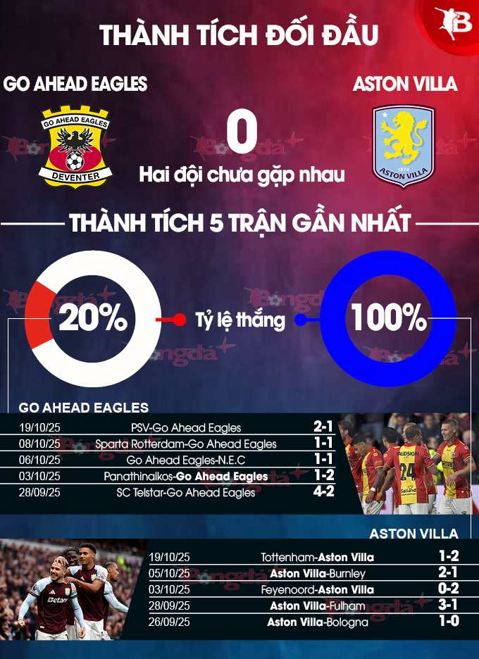 Mặc dù Go Ahead Eagles có lợi thế sân nhà nhưng cũng chỉ có 1 lần được hưởng niềm vui kể từ khi mùa giải mới tranh. Ngược lại, Aston Villa chỉ thua 1/4 trận gần nhất khi làm khách.