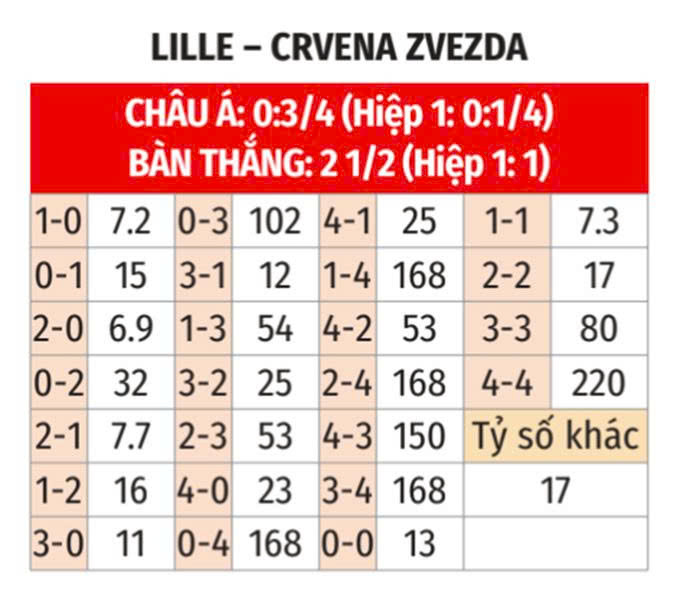 - Crvena Zvezda thắng theo châu Á: Crvena Zvezda thắng 5/6 trận gần nhất, thắng cả 5 chuyến làm khách gần đây. Còn Lille thua 9/10 trận vừa qua, thua 4/5 trận sân nhà gần nhất. Do đó, Crvena Zvezda nhiều khả năng sẽ thắng theo châu Á ở trận này.