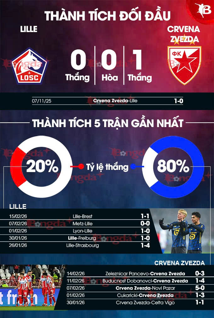 Cần nhấn mạnh rằng, phong độ của Crvena Zvezda hoàn toàn trái ngược với Lille lúc này. Họ thắng 5 và hòa 1 ở 6 trận gần đây. Trên sân đối phương, thày trò HLV Dejan Stankovic đang bất bại 8 trận, bao gồm 7 chiến thắng và 1 trận hòa, trong đó có 5 trận thắng liên tiếp gần nhất.