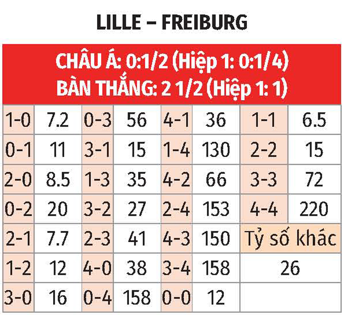 - Lẻ bàn thắng: 9/10 trận gần nhất của Lille có tổng bàn thắng không chia hết cho 2. Ngoài ra, 6/9 trận vừa xong của Freiburg chứng kiến điều tương tự.