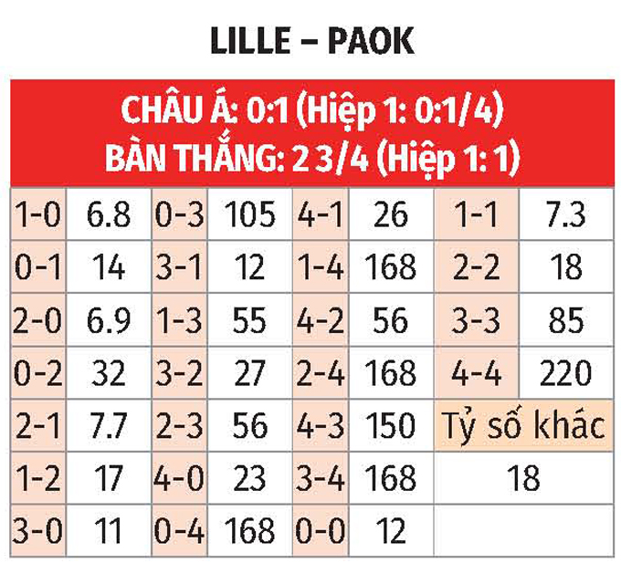 - Chẵn bàn thắng: 2 trận gần nhất của Lille có tổng bàn thắng chia hết cho 2. Ngoài ra, 5/6 trận vừa qua của PAOK chứng kiến điều tương tự.