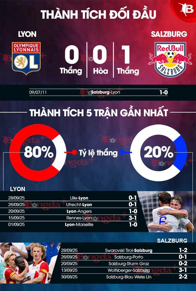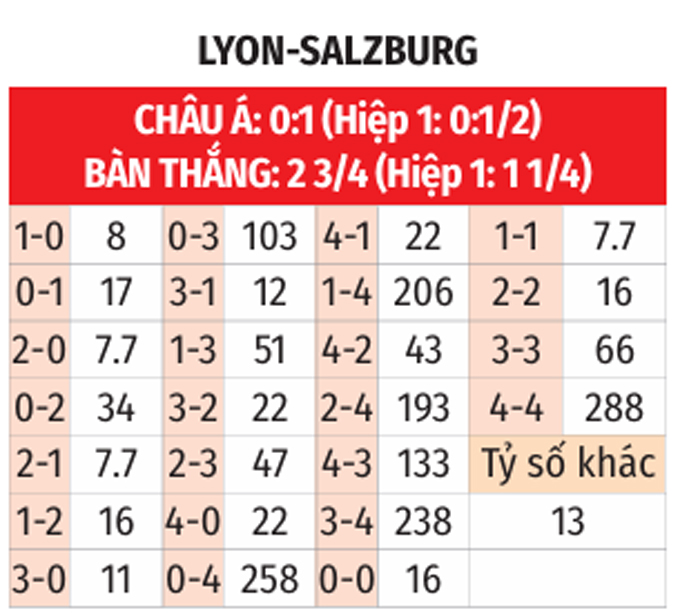 - Hiệp 1 ít bàn thắng: Cả 6/7 trận chính thức kể từ đầu mùa lẫn 4/5 trận chính thức gần nhất trên sân nhà của Lyon chỉ có 1 bàn thắng trong hiệp 1. Kịch bản này cũng diễn ra ở 3/4 trận gần đây của Salzburg.