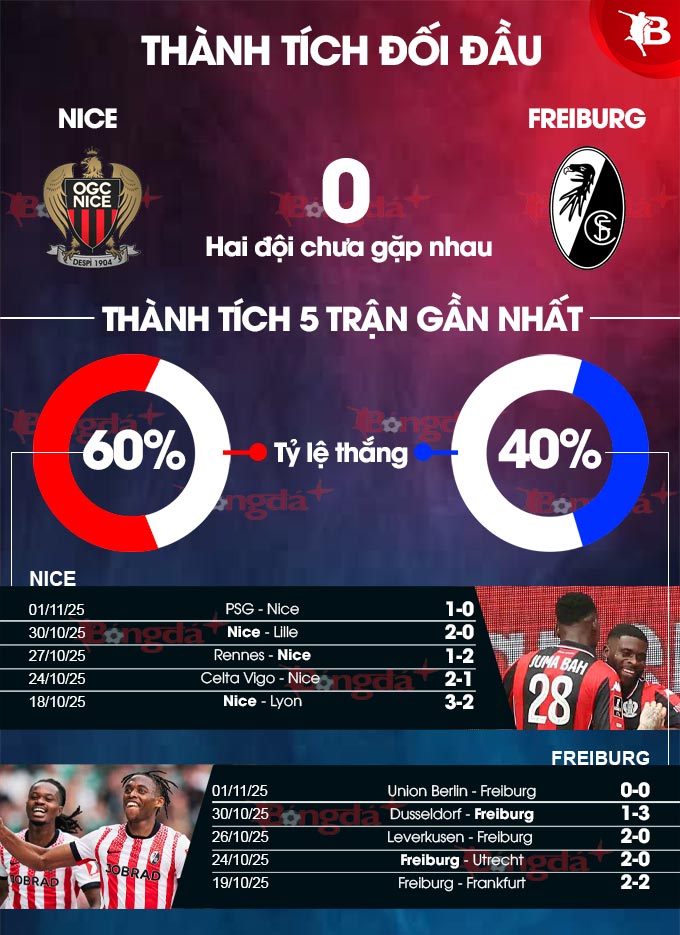 Trước khi đón tiếp Freiburg, phong độ của Nice cũng khá phập phù với 3 chiến thắng, 1 trận hòa và 2 thất bại ở 6 trận gần đây. Tuy vậy, trên sân nhà, đội bóng của HLV Franck Haise lại thi đấu khá ấn tượng, với 4 chiến thắng, 1 trận hòa và chỉ 1 thất bại ở 6 trận vừa qua.
