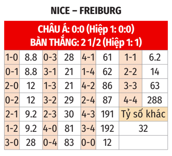 - Nice thắng theo châu Á: Nice thắng 5/6 trận gần nhất, thắng cả 2 trận sân nhà vừa qua. Trong khi đó, Freiburg không thắng 6/9 trận gần đây, không thắng 5/8 trận sân khách gần nhất. Do đó, nhiều khả năng Nice sẽ thắng theo châu Á trận này.