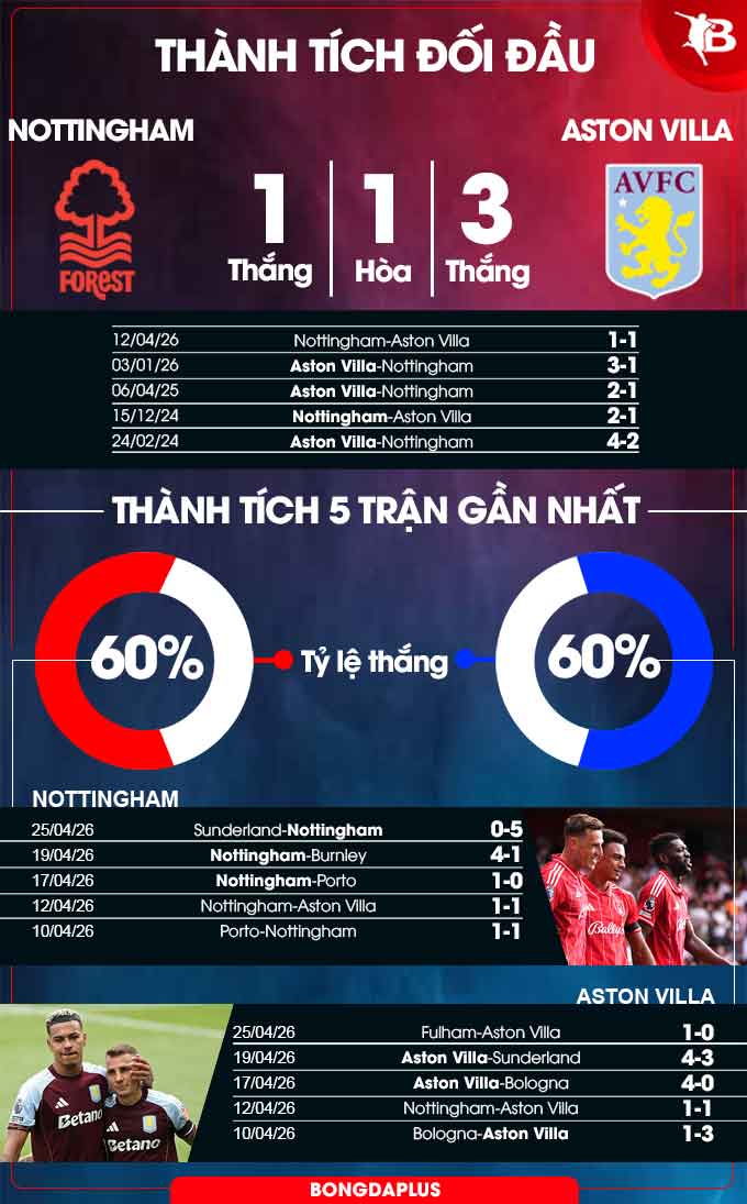- Hai đội cùng ghi bàn: 13/16 cuộc đối đầu gần nhất, 7/9 cuộc chạm trán gần đây tại sân City Ground và 4/6 trận vừa qua của Aston Villa đều có ít nhất 1 bàn thắng cho mỗi đội. Hơn nữa, Nottingham luôn ghi bàn ở cả 7 trận gần đây, Aston Villa làm được điều tương tự ở 10/11 trận gần đây.
