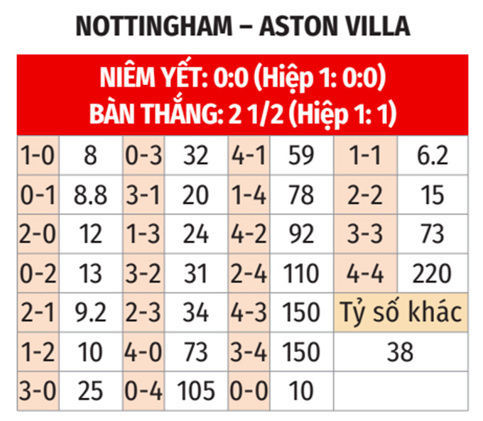 - Cuối hiệp 1 có bàn thắng: 4/5 cuộc chạm trán gần nhất, 6/7 trận gần đây của Nottingham và cả 7 trận vừa qua của Aston Villa đều có ít nhất 1 bàn thắng từ phút 16-45 của hiệp 1. Xem ra, nhiều khả năng trận này cũng sẽ chứng kiến tối thiểu 1 bàn thắng ở 30 phút cuối hiệp 1.