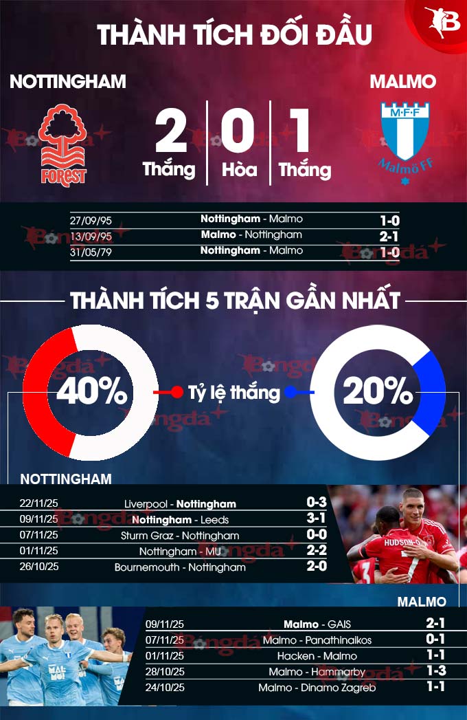 Trong khi Nottingham bất bại 4 trận gần nhất thì Malmo chỉ thắng 1/5 trận vừa xong. Nottingham có lợi thế sân nhà và không thua ở 3 trận gần nhất (thắng 2, hòa 1) còn Malmo chỉ thắng 2/5 trận vừa qua trên sân khác.