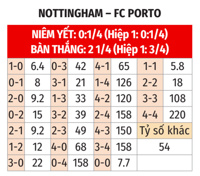 - 2 hoặc 3 bàn cả trận: Cả 4 trận gần đây của Nottingham và 5/7 trận gần đây của Porto đều có 2 hoặc 3 bàn. Hơn nữa, cả 4 chuyến làm khách gần đây của Porto trong khuôn khổ Europa League cũng khép lại với 2 hoặc 3 bàn cả trận.