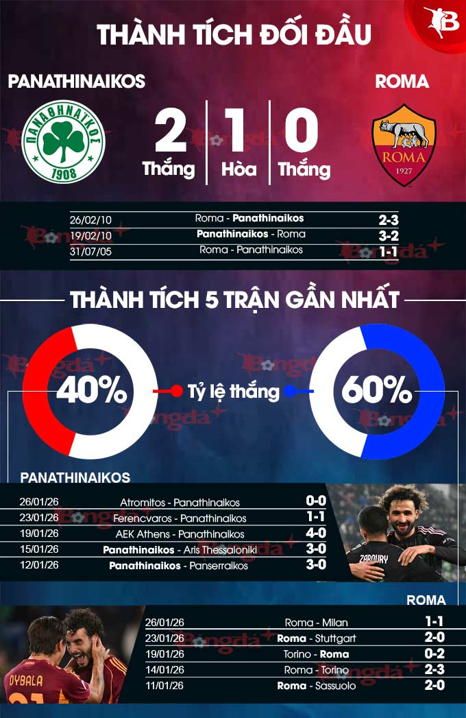 Và, tình hình của Panathinaikos lại khác khi họ thi đấu trên sân nhà. Chuỗi 5 trận bất bại gần nhất (4 thắng, 1 hòa) tại Athens giúp thày trò HLV Rafael Benitez rất tự tin khi đón tiếp Roma.