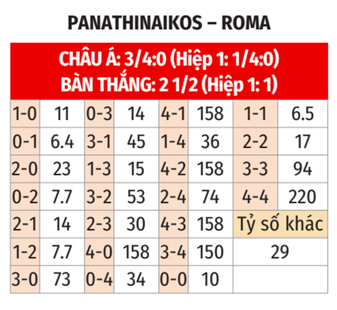 - 2 hoặc 3 bàn cả trận: 6/8 trận gần nhất của Panathinaikos và 5/6 trận gần đây của Roma đều có từ 2-3 bàn cả trận. Hơn nữa, 6/9 trận sân nhà gần đây của Panathinaikos và 4/5 chuyến làm khách vừa qua của Roma cũng chứng kiến 2 hoặc 3 lần lưới rung cả trận.