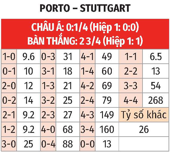 - Lẻ bàn thắng: 6/9 trận gần nhất của Porto có tổng bàn thắng không chia hết cho 2. Chưa hết, 5/8 trận sân khách vừa xong của Stuttgart cũng chứng kiến điều tương tự.