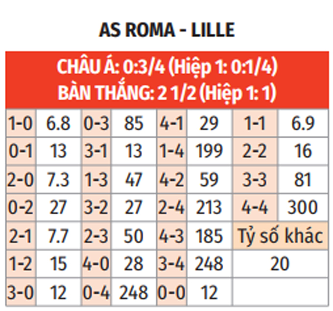 - Lẻ bàn thắng: 5/7 trận gần nhất của Roma có tổng bàn thắng không chia hết cho 2. Ngoài ra, 5/6 trận vừa qua Lille đều chứng kiến điều tương tự.