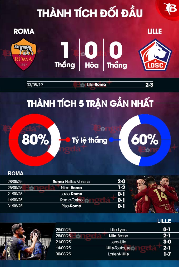 - Hai đội cùng ghi bàn: Roma đã thành công trong việc ghi bàn ở 4/5 trận gần nhất còn với Lille là ở 3/5 trận vừa xong. Bên cạnh đó, Roma cũng ghi bàn ở 4/5 trận chính thức gần nhất trên sân nhà, còn với Lille là 3 trận vừa qua tại sân khách. Với xu hướng như vậy, khả năng cao hai đội sẽ cùng tìm được đường vào khung thành của nhau.