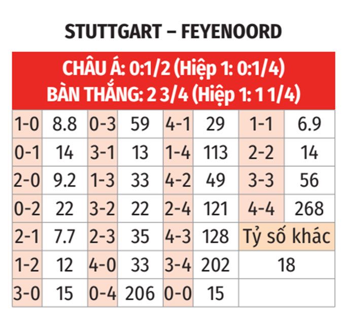 - Tối đa 1 bàn hiệp 1: 6/7 trận gần đây của Stuttgart chỉ có tối đa 1 bàn trong hiệp 1. 5/8 trận vừa qua của Feyenoord cũng diễn ra theo kịch bản này.