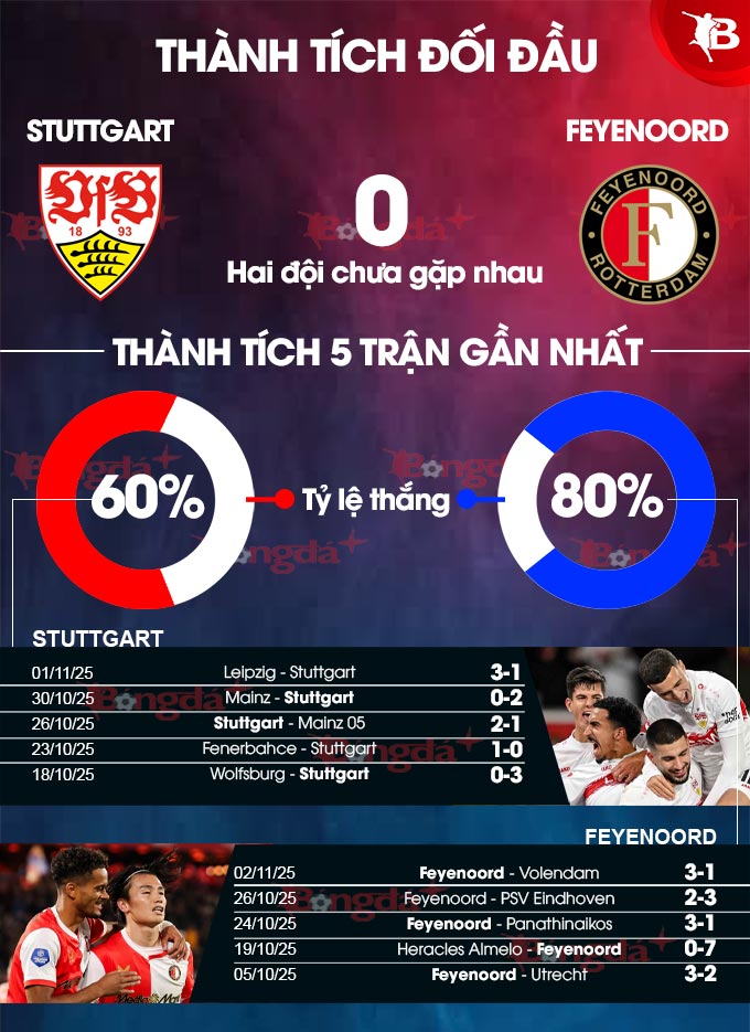 So với Stuttgart thi đấu thất thường, Feyenoord đang làm tốt hơn ở chỗ họ có tần suất thắng khá dày. Với việc vừa vượt qua Volendam 3-1 ở giải trong nước, tính ra đội bóng của cựu danh thủ Robin van Persie đã hạ tới 4 đối thủ trong 5 trận vừa qua. Ấn tượng nhất phải kể đến thắng lợi tưng bừng 7-0 ngay trên sân của Heracles Almelo hôm 19/10.
