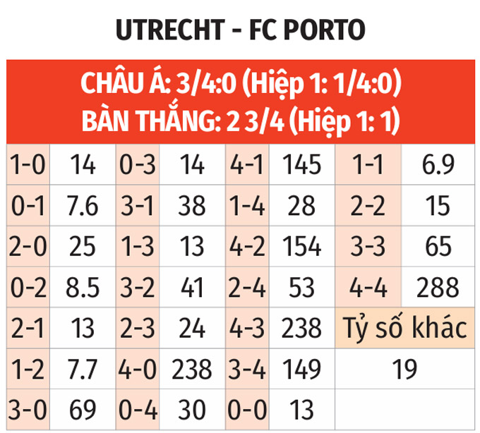 - Lẻ bàn thắng: 7/10 trận gần nhất của Utrecht có tổng bàn thắng không chia hết cho 2. Ngoài ra, 6/10 trận vừa qua của Porto chứng kiến điều tương tự.