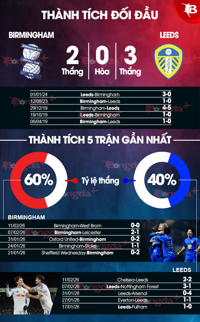 - Hai đội cùng ghi bàn: Birmingham ghi được ít nhất 1 bàn ở 7/8 trận gần nhất và 8/9 trận sân nhà vừa qua của họ đều khép lại với ít nhất 1 bàn cho mỗi đội. Ngoài ra, 6/8 trận gần nhất của Leeds và 8/9 trận sân khách vừa qua của Leeds cũng khép lại mà không đội nào giữ sạch lưới nhà.