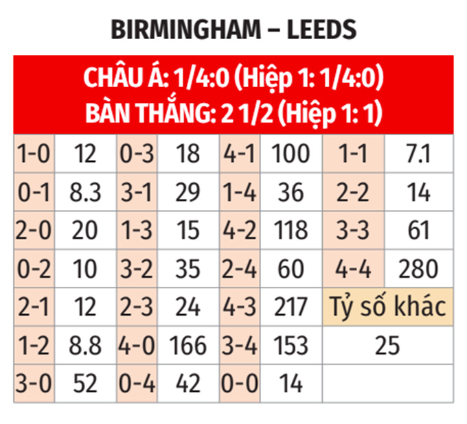 - Leeds không thua theo châu Á: Leeds không thua 5/6 trận gần nhất, không thua 7/8 trận sân khách gần đây. Còn Birmingham thua 5/7 trận sân nhà vừa qua. Vì thế, có thể tin tưởng vào Leeds ở trận này.