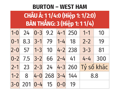 Tổng bàn thắng là số chẵn: 6/7 trận sân nhà gần nhất của Burton có tổng bàn thắng là số chẵn. 4/6 trận gần nhất của West Ham có kịch bản tương tự. Số lần lưới rung trận này sẽ chia hết cho 2.