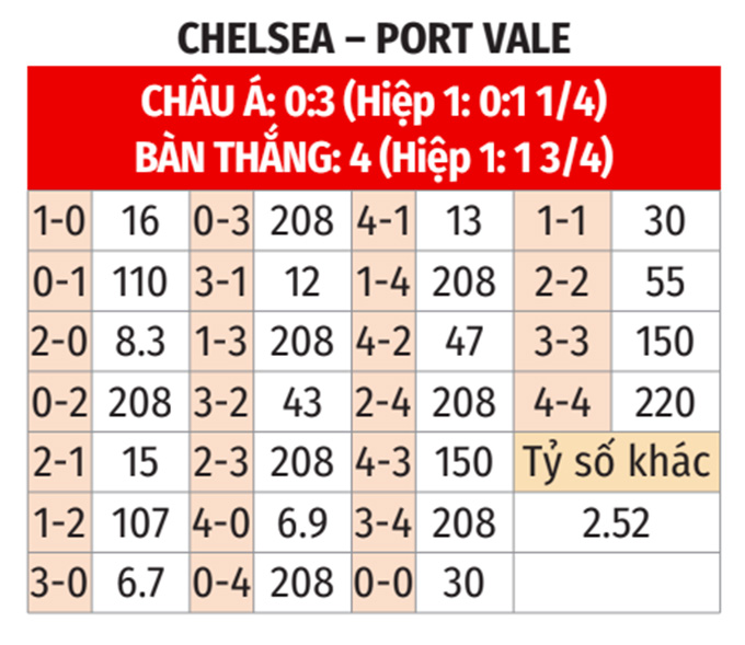 - Ít thẻ phạt: Chỉ có 7 thẻ phạt ở 4 trận gần nhất của Chelsea. Ngoài ra, 5 trận gần nhất của Port Vale cũng chỉ xuất hiện 15 thẻ phạt, tương đương 3 thẻ/trận. Do đó, nhiều khả năng trận này sẽ có không quá 4 thẻ phạt cả trận.