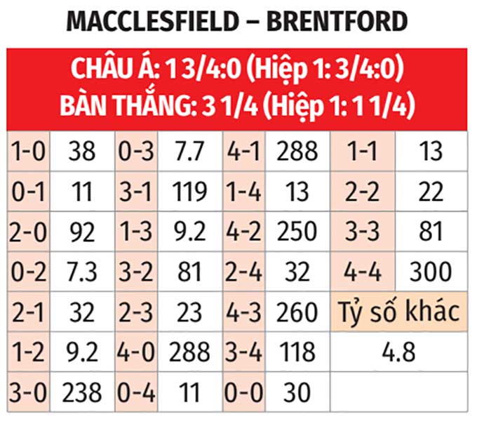 - Tối đa 2 bàn: 5/6 trận gần đây của Brentford chỉ có tối đa 2 bàn. Cả 4 cuộc đụng độ trước đây giữa họ và Macclesfield Town cũng không có quá 2 lần lưới rung.