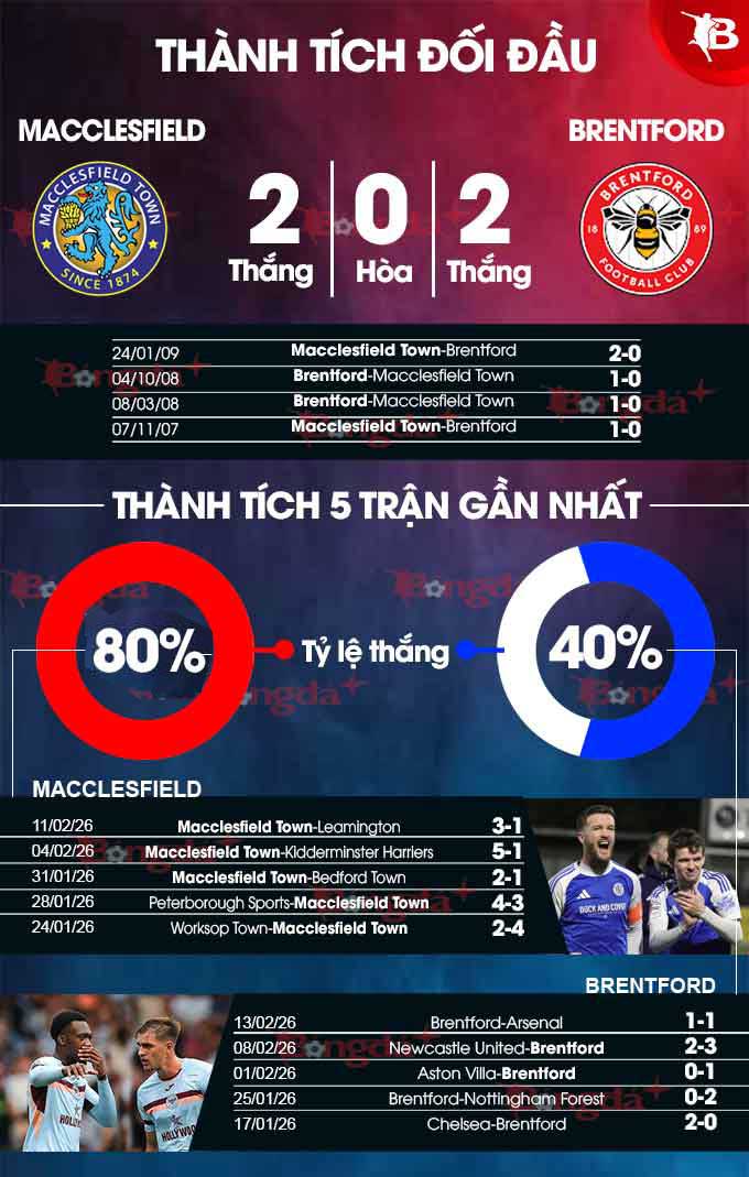 Bất chấp thực tế trên, Macclesfield Town vẫn không đáng được xem là đối thủ xứng tầm với Brentford. Nên nhớ, Brentford đang chinh chiến ở Premier League và họ vừa xuất sắc cầm chân đội đầu bảng Arsenal với tỷ số 1-1. Đây là trận thứ 9 Brentford bất bại trong 11 trận gần đây (thắng 7). Với thành tích đáng nể như vậy, Brentford đủ khả năng thuần phục "chú ngựa ô" Macclesfield Town, dù phải chơi trên sân khách.