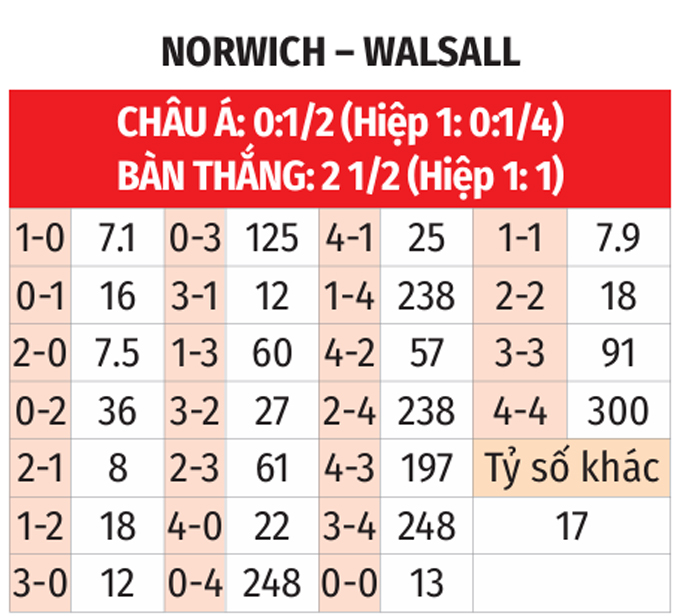 - Hai đội cùng ghi bàn: Norwich và Walsall thành công trong việc ghi bàn ở 8/10 trận gần nhất. Bên cạnh đó, Norwich ghi bàn ở 5/7 trận vừa qua trên sân nhà còn với Walsall là ở 7/10 trận sân khách gần đây. Với xu hướng như vậy, khả năng cao hai đội sẽ cùng tìm được đường vào khung thành của nhau.