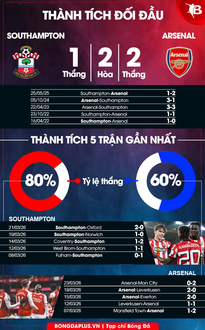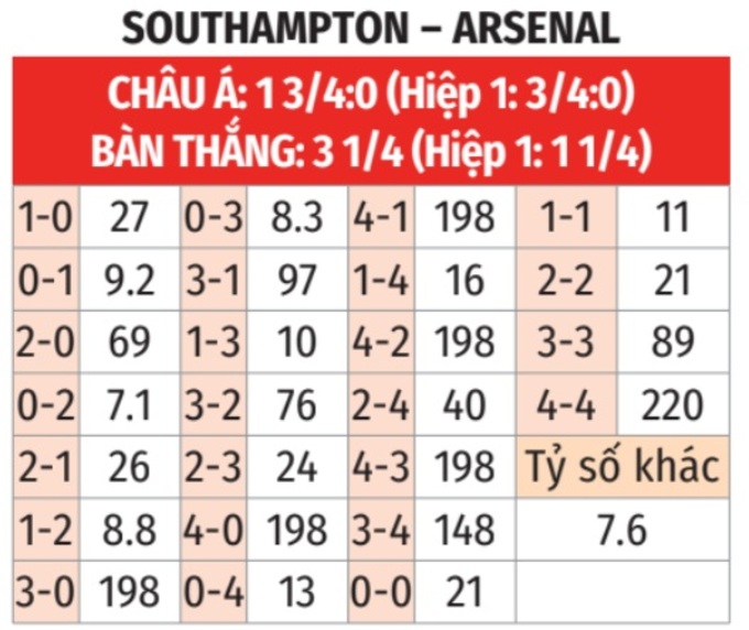 - Tối đa 2 bàn cả trận: 4/5 trận gần đây của Southampton và 5/6 trận gần nhất của Arsenal chỉ có nhiều nhất 2 bàn thắng. 4/6 lần chạm trán giữa 2 đội vừa qua xảy ra tình trạng tương tự.