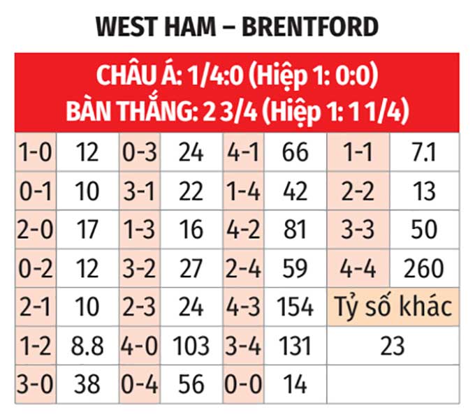 - Hai đội không cùng ghi bàn: 3/4 trận đây của West Ham đều có đội "tịt ngòi". 3/4 trận vừa qua của Brentford cũng có đội thành công trong việc giữ sạch lưới.