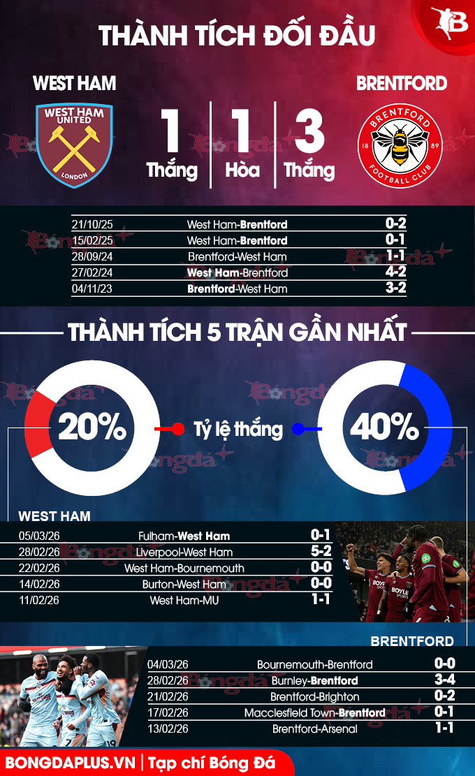 West Ham không được lịch sử ủng hộ do họ phải nhận tới 7 thất bại trong 10 lần chạm trán Brentford gần nhất. Tiếp đón đối thủ có duyên trên sân khách như Bầy ong, đội bóng có biệt danh Búa tạ dễ lại phải nhận kết cục buồn trước sự chứng kiến của đám đông khán giả nhà.