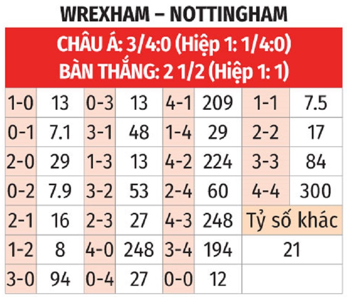 - Hai đội cùng ghi bàn: Các trận đấu gần đây của Wrexham thường xuyên có bàn thắng ở cả hai đầu sân, trong khi hàng phòng ngự của Forest cho thấy họ khó có thể giữ vững thế trận trước một đội bóng đang có phong độ tấn công tốt. Đồng thời, Nottingham vẫn sở hữu đủ chất lượng để ghi bàn vào lưới một hàng phòng ngự thường xuyên để lọt lưới của đội chủ nhà.