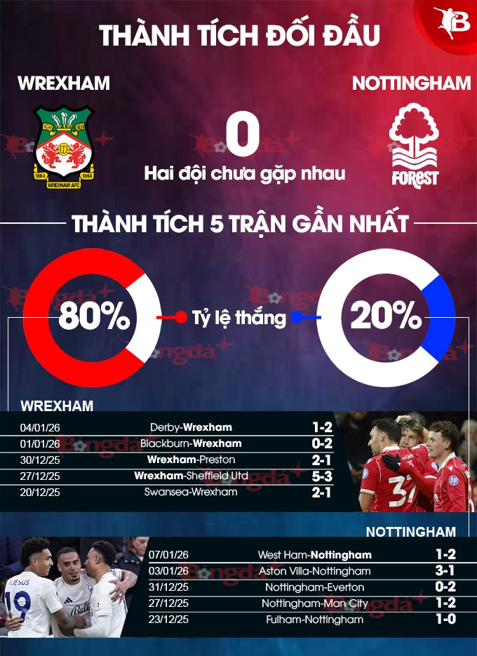 - Nhiều bàn thắng: 5/6 trận gần đây của Wrexham đều kết thúc với ít nhất 3 bàn thắng được ghi. Với Nottingham, 6/8 trận vừa qua của các cầu thủ khách cũng xuất hiện tối thiểu 3 pha làm bàn.