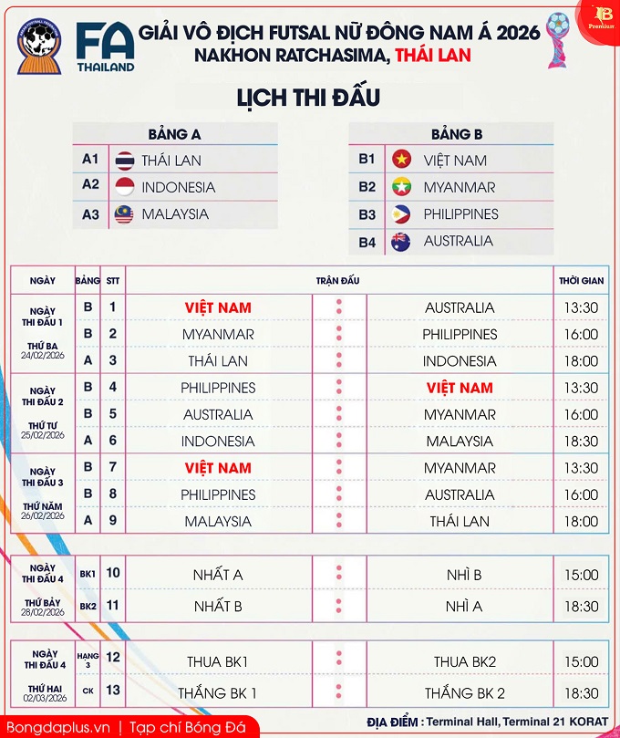 Thái Lan đã công bố lịch thi đấu tại giải nữ futsal Đông Nam Á 2026. Bảng đấu của ĐT futsal nữ Việt Nam có 4 đội, trong khi bảng Thái Lan chỉ có 3 đội. Nước chủ nhà đặt đoàn quân ông Nguyễn Đình Hoàng vào thế hết sức khó khăn khi thi đấu mỗi ngày/trận. Ngoài ra, cả 3 trận đấu của ĐT futsal nữ Việt Nam đều diễn ra vào lúc 13h30. Mốc thời gian này ảnh hưởng đến công tác sinh hoạt, chuyên môn. Kéo theo đó, BHL ĐT futsal nữ Việt Nam phải đau đầu để tính toán.