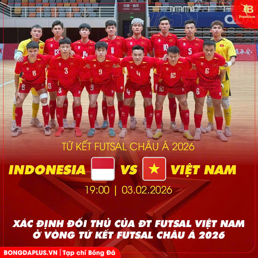 Cùng có 7 điểm sau vòng bảng nhưng với hiệu số +7 so với +3 của Iraq, Indonesia đứng nhất bảng và sẽ gặp ĐT futsal Việt Nam ở tứ kết futsal châu Á 2026. Trận đấu sẽ diễn ra vào lúc 19h00 ngày 3/2 tại nhà thi đấu Arena Indonesia. Ở SEA Games 33, 2 đội đã chạm trán nhau với phần thắng 1-0 nghiêng về ĐT futsal Việt Nam.