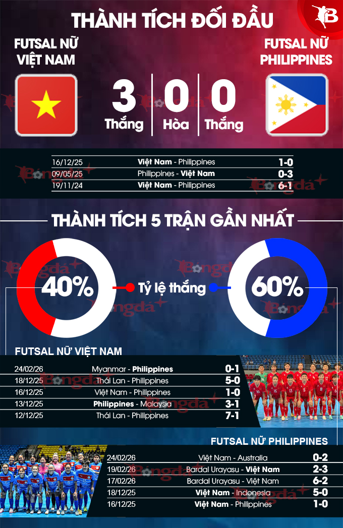 Trong lịch sử đối đầu, ĐT futsal nữ Việt Nam và Philippines gặp nhau 3 lần và phần thắng đều nghiêng về ĐT futsal nữ Việt Nam. Dù vậy, thành tích ấy chỉ có ý nghĩa tham khảo. Philippines đã chú trọng đầu tư futsal trong thời gian qua để tổ chức World Cup futsal nữ 2025. Vì thế, trình độ của họ đã được cải thiện rất đáng kể.