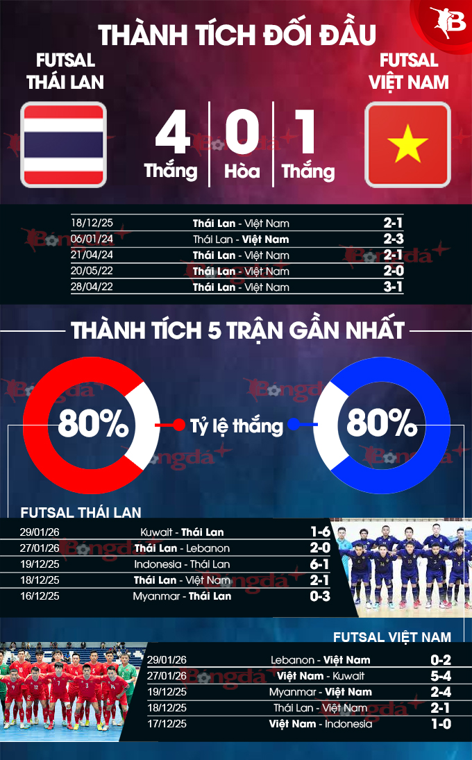 - ĐT futsal Thái Lan đã thị uy sức mạnh của đội bóng hàng đầu châu Á bằng 2 chiến thắng giòn giã trước Lebanon và Kuwait. Pivo Osamanmusa tiếp tục chứng tỏ đẳng cấp của chân sút xuất sắc ghi khi đến 5 bàn trong tổng số 8 pha lập công sau 2 trận của ĐT futsal Thái Lan. Nhìn tổng thể về chất lượng đội hình, thành tích của quá khứ thì phải thừa nhận, đội futsal xứ Chùa vàng ở thế “cửa trên” so với ĐT futsal Việt Nam trong cuộc đối đầu này.