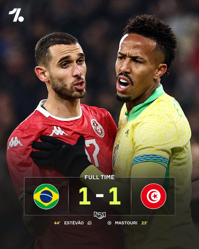 Tới phút 90+6, Estevao tung cú dứt điểm cực căng đưa bóng dội cột dọc trái khung thành của Tunisia trong sự tiếc nuối của toàn đội Brazil